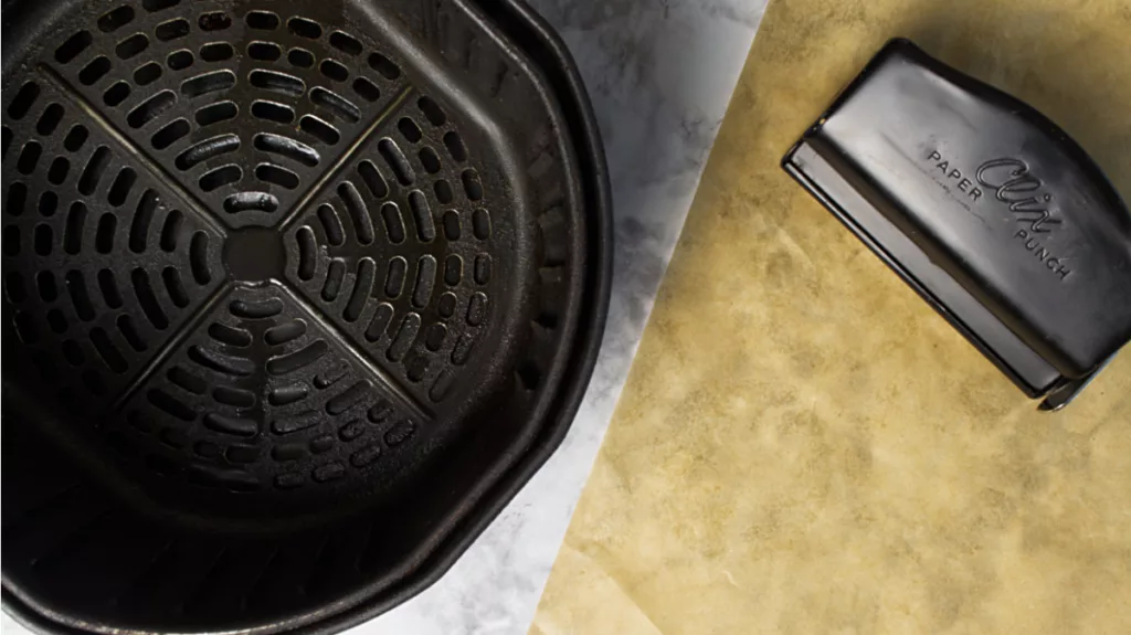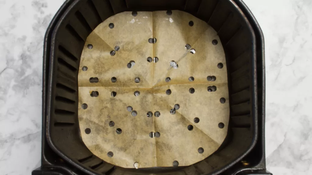 - Line the Air Fryer basket with burn resistant paper such as parchment with holes punched in it to allow air flow.