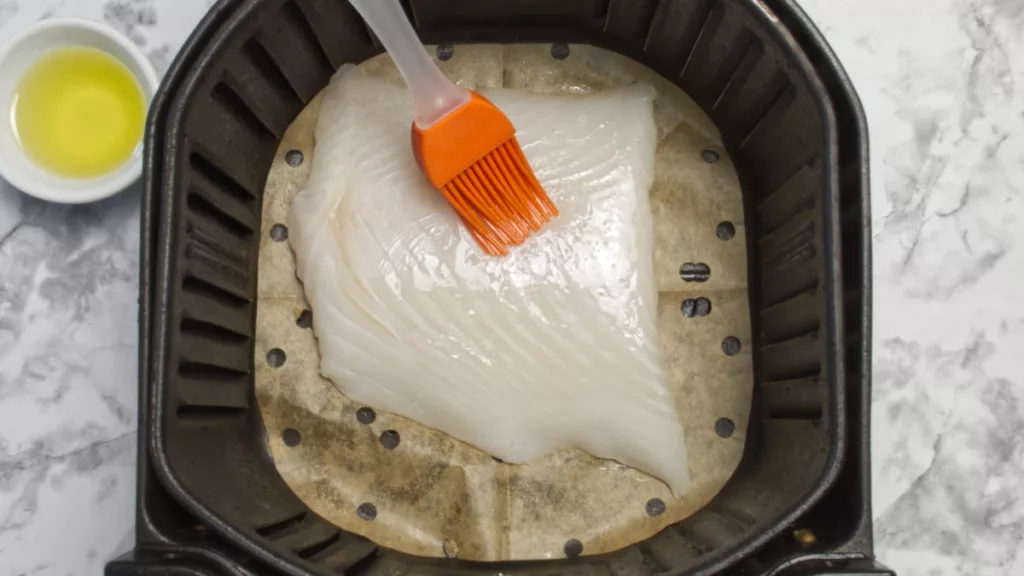 - Lower the Halibut and into the Air Fryer basket and brush with oil. Brush only the top side of the fish.