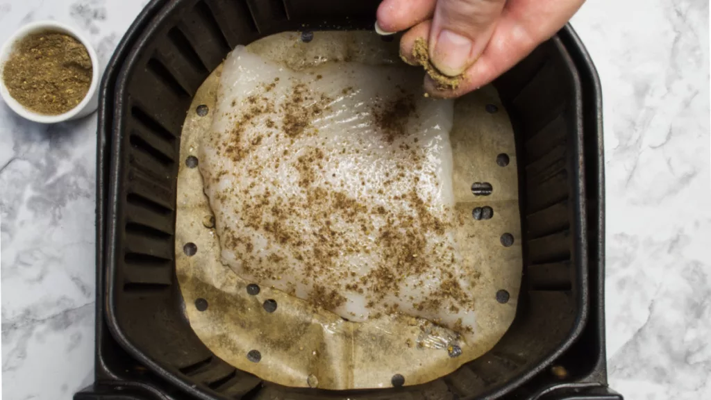 Remove excess moisture from Halibut before Air Frying. If there is excess moisture, it will cause the fish to steam rather than fry. Dab the fish flesh gently with a couple of sheets of disposable kitchen paper (kitchen roll).