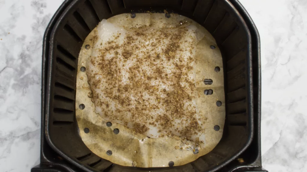When cooking Halibut in the Air Fryer, it is a good idea to line the basket of the Air Fryer with a burn resistant paper such as parchment. This rule applies with any type of fish. If the fish does start to fall apart, the paper catches it all. Another alternative is to use a silicone Air Fryer liner like this one.