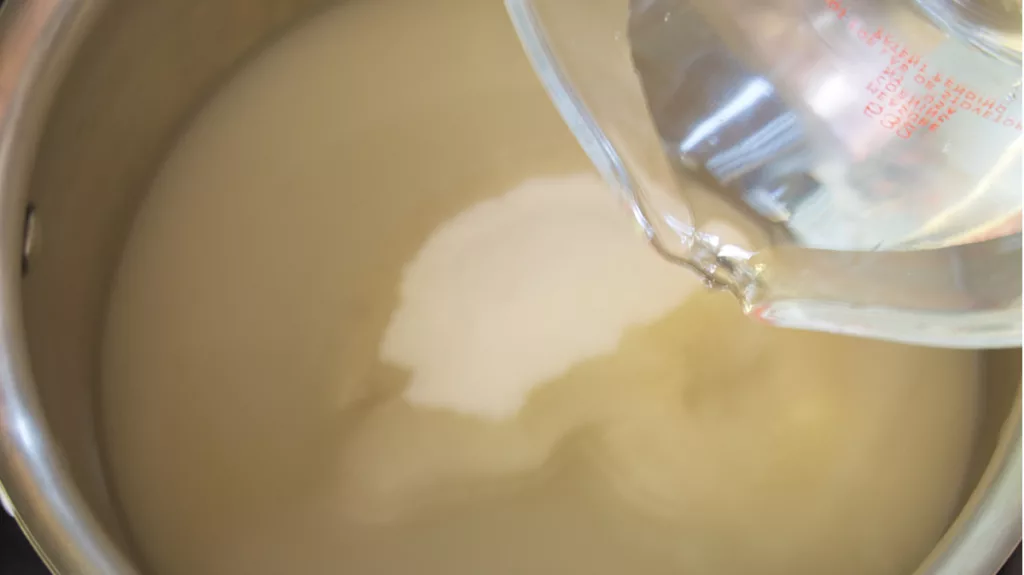 - Pour water onto the sugar in the pot. Over a medium heat, start to caramelize the sugar.