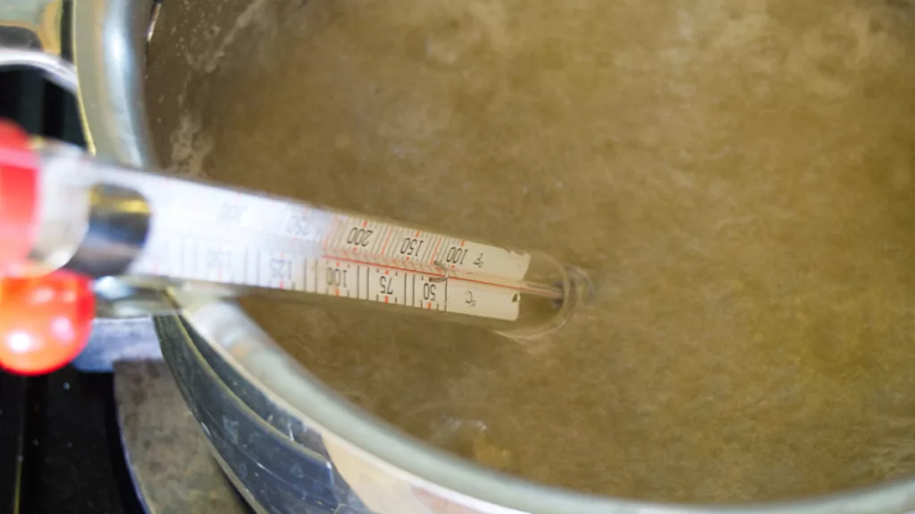 The caramelization process can reach temperatures in the range of 350 degrees F. That’s enough to cause a second degree burn. It’s a good idea to have a bowl of iced water on stand by. If you don’t use it – that’s great, you can water the plants with it!