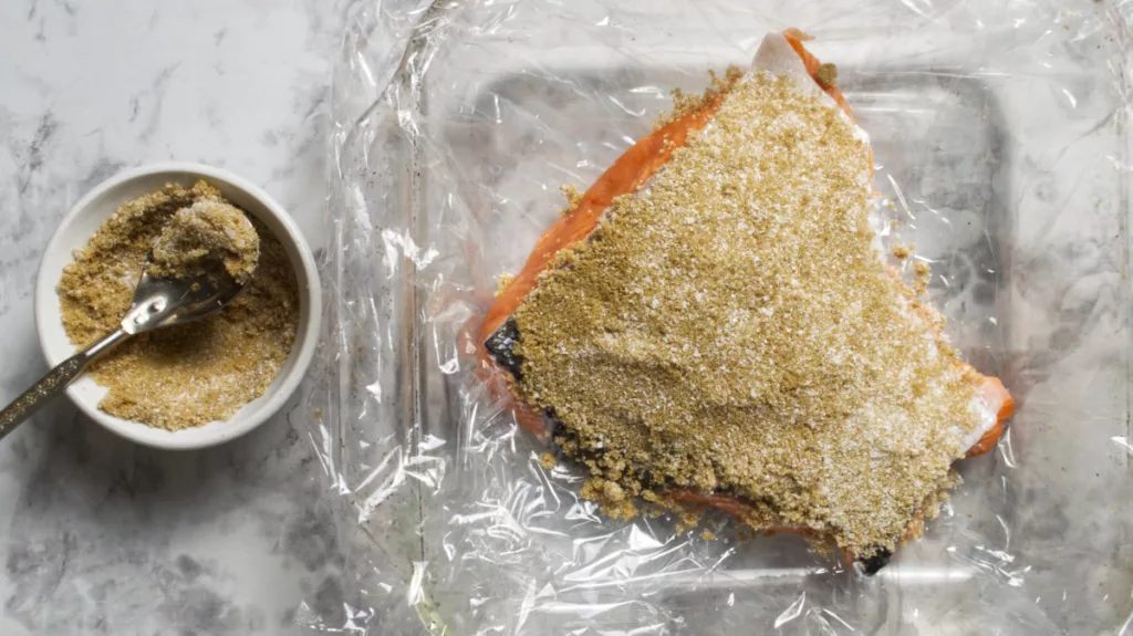 Lay the plastic wrap in a container and then apply the curing mixture. Any loose salt and sugar will fall into the plastic wrap. This approach will keep the kitchen a little less messy!
