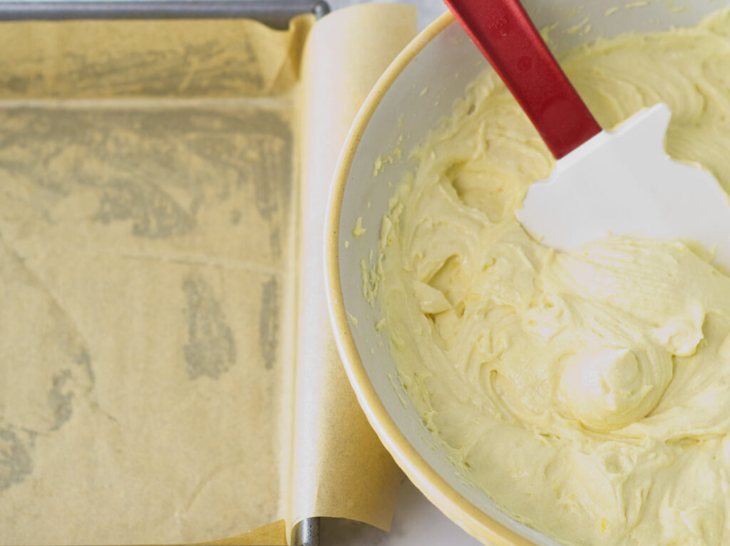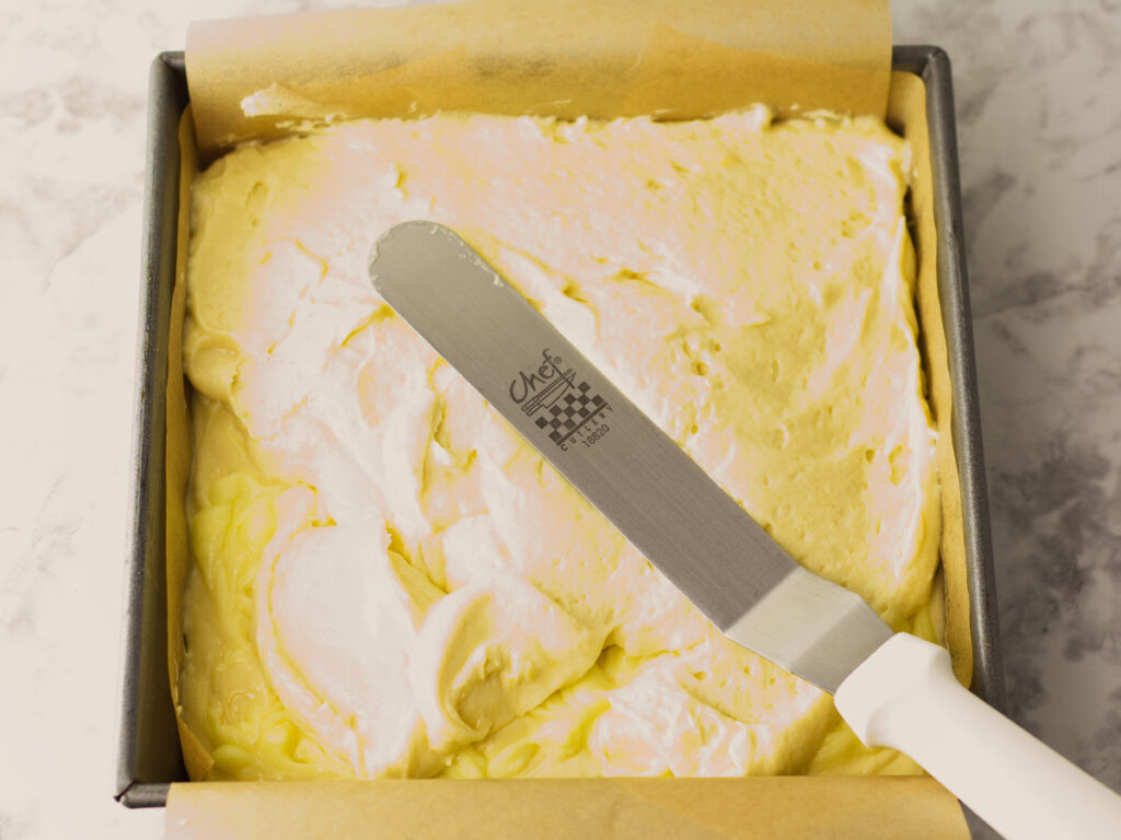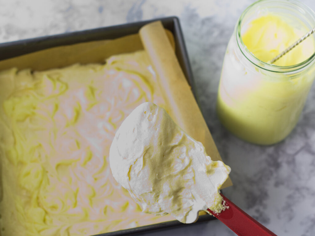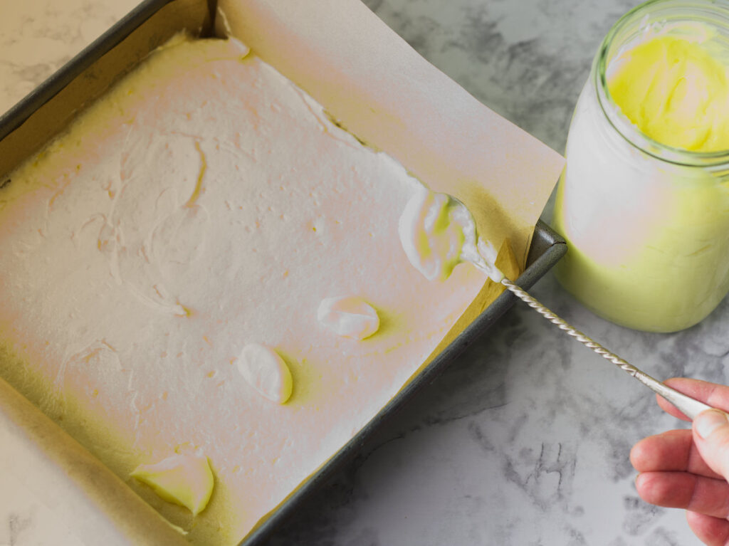 - Then spread half the batter on top of the lemon curd.