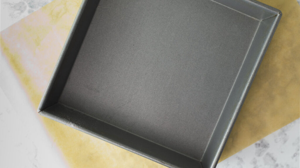 - Preheat the oven to 350 degrees F / 180 degrees C. Grease the bottom and sides of a 9 inch (22 cm) square cake pan and then line with parchment paper.