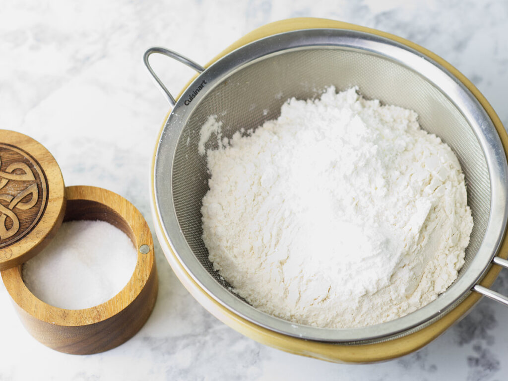 - In a separate bowl, sift in the flour, salt, cornstarch and baking powder.