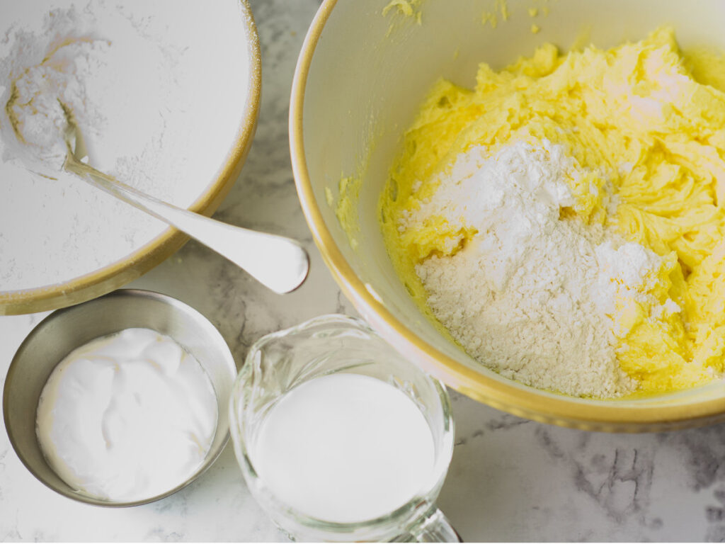- Repeat the steps of adding flour, milk and sour cream until all of these ingredients are in the creamed mixture. Add the lemon juice and zest.