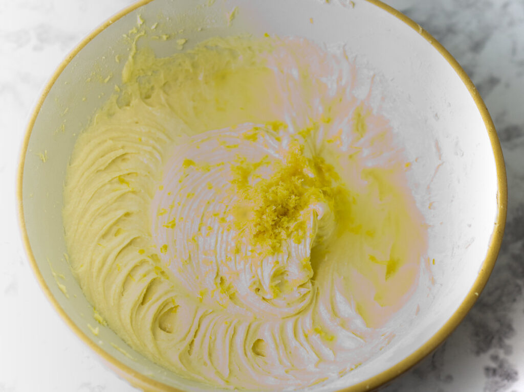 Repeat the steps of adding flour, milk and sour cream until all of these ingredients are in the creamed mixture. Add the lemon juice and zest.