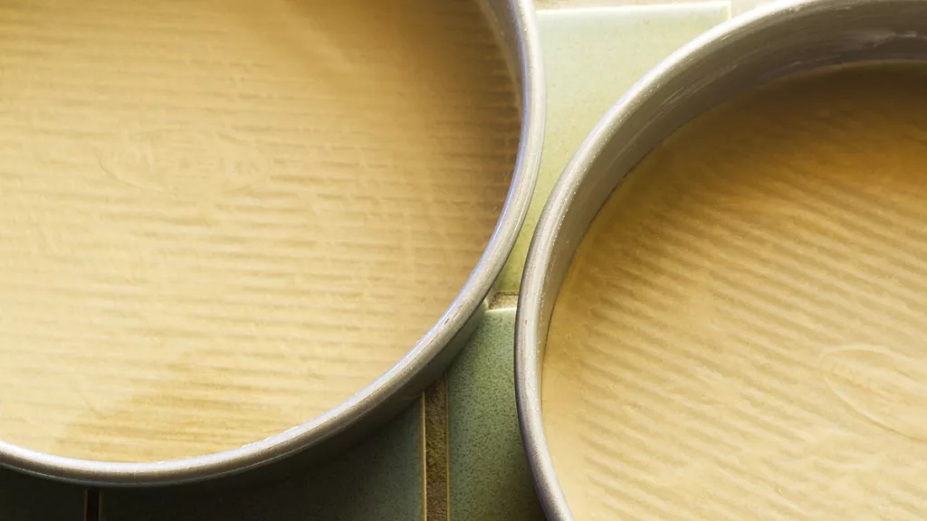 - With wax paper (grease proof paper) and a little butter or oil, grease the bottom and sides of two 9 inch cake pans.