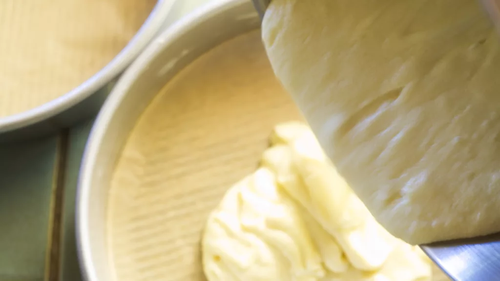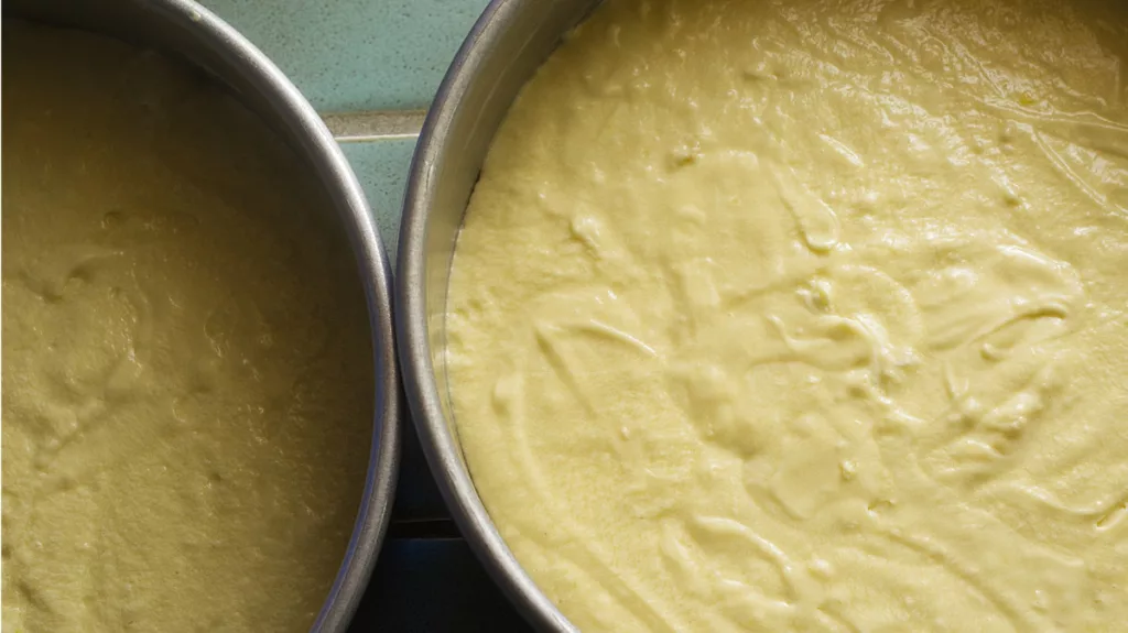2) Secondly, you’ll be able to notice the cake is on its way to being golden brown. The sides of the cake are parting from the walls of the cake pan, and the cake has risen in depth.