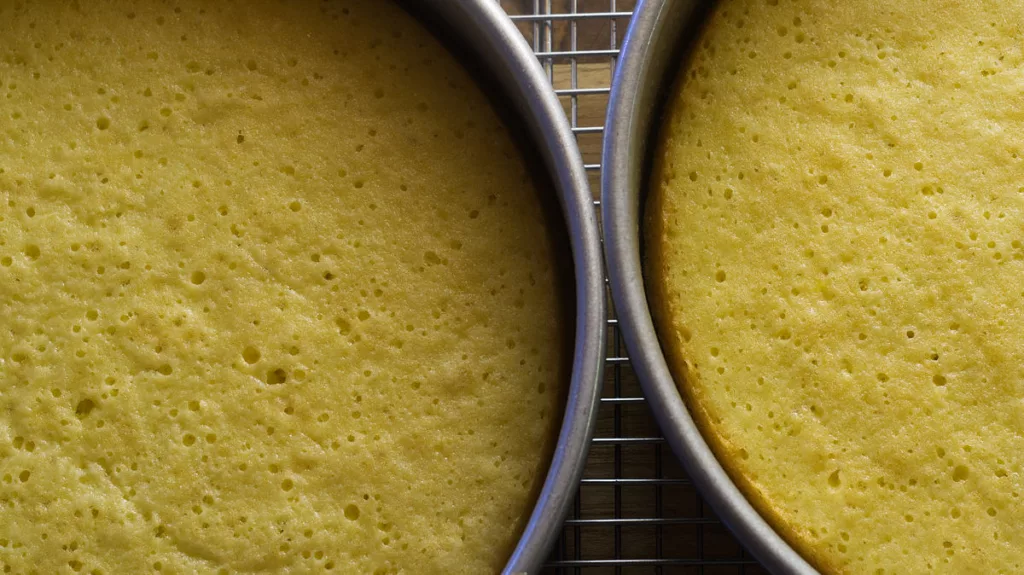 When the cake has finished baking, remove it from the oven and place the cake pans on a wire rack. This allows air to reach the bottom of the pans as well as the sides and will allow the cakes to cool and not continue baking.