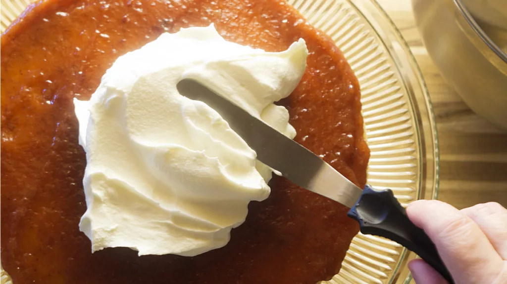 While the cream is whipping, remove the paper from the base of each cake layer.
