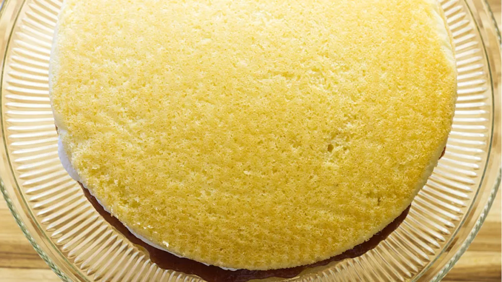 - Place one cake layer onto a serving plate and add the jam. Spread the jam evenly over the sponge cake.