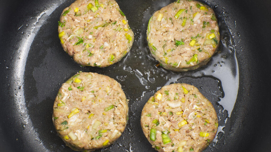 Added to the ground beef is an onion based vegetable. Typically leeks are the most common onion choice, both the white onion bulb part and the green leaves. Scallions, chives and even regular onions will work. At a pinch use shallots or garlic.